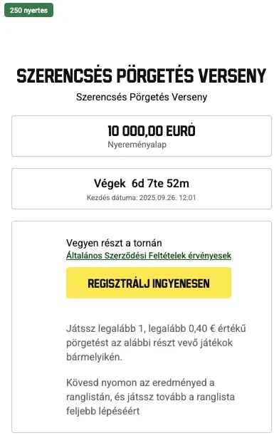 - Heti Wheel Drops & Napi versenyek: Hat hónapon át tartó akció, napi 9 000 000 HUF nyereménnyel. Hetente indul, nem kell regisztrálni vagy minimum tétet tenni. Csak a kijelölt Pragmatic Play nyerőgépeken kell játszanod. Haladj felfelé a ranglistán a nagyobb díjakért.
