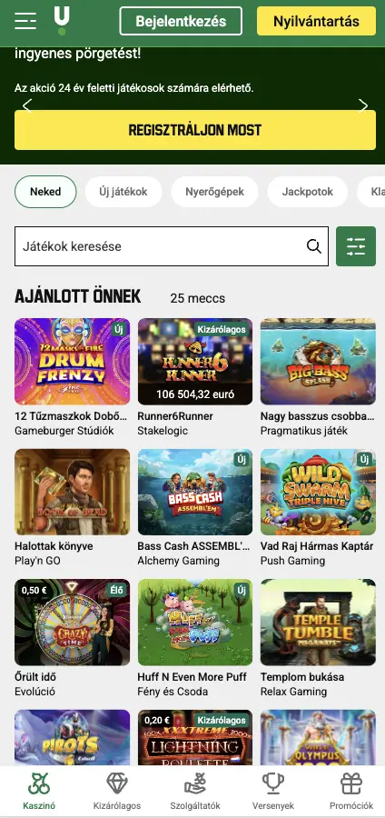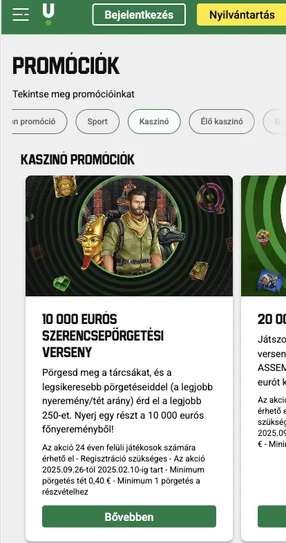 Új játékosként 18 000 HUF üdvözlő bónuszt kaphatsz a regisztráció és fiókellenőrzés után. Emellett 9 000 HUF sportfogadási és 9 000 HUF kaszinóbónusz is elérhető, plusz különleges ajánlatok a visszatérő játékosoknak.