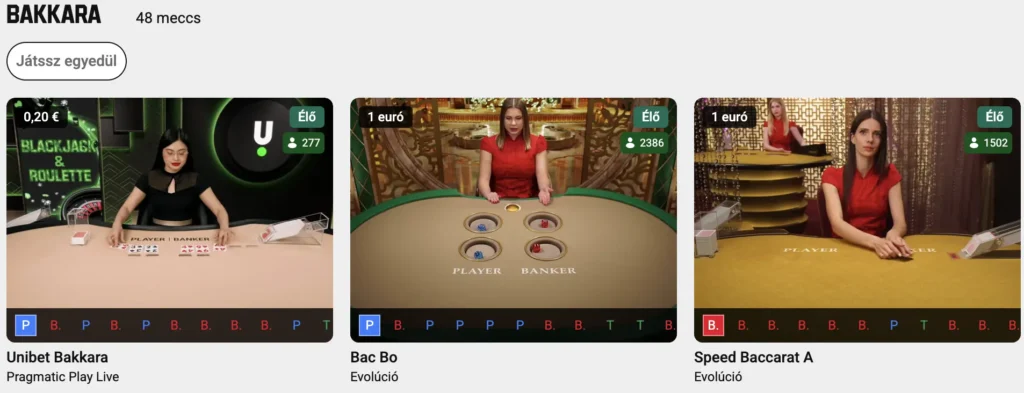Az élő baccarat ugyanazon az elven működik, mint a hagyományos változat – az eredmény lehet döntetlen, játékos kéz vagy bankár kéz. Mellékfogadásokat és statisztikákat is találsz, amikkel az Uni bet játékok élő krupiékkal még valósághűbb élményt nyújtanak. Az Unibet élő baccarat kínálata jelenleg 78 címből áll. Néhány érdekes változat, amivel találkozhatsz:
