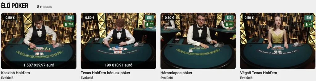 Élő játékaink négy vezető szoftverszolgáltatótól származnak: On Air Entertainment, Stakelogic, Evolution és Pragmatic Play. Ezek a cégek a kiemelkedő minőségről híresek. Az Evolution úttörő volt, hiszen elsőként vezette be a pörgősebb formátumokat és a tévéműsor-szerű játékokat.