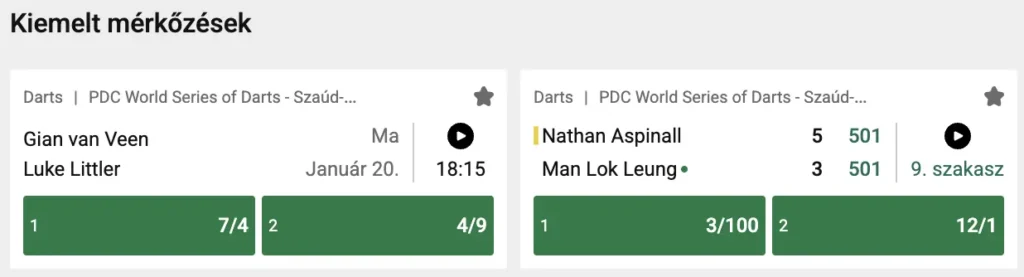 Az online közvetítés az élő fogadásokkal párosul a teljes lefedettség érdekében. A checkout százalékok és az átlagos pontszámok élő statisztikaként jelennek meg. A gyors tempójú jelleg gyakori fogadási ablakokat teremt. Az olyan jelentős események, mint a UK Open és a World Matchplay promóciós támogatást kapnak, ami a megtérülést fokozza.
